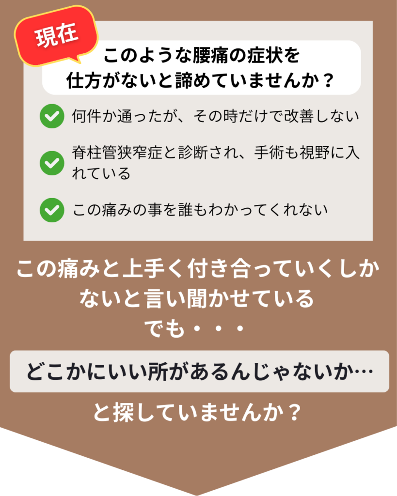 あなたの症状に真正面から向き合う、痛みしびれ専門 【イルミナ】 に来院し、もう二度とその腰痛・坐骨神経痛を我慢することのない人生を手に入れる道。