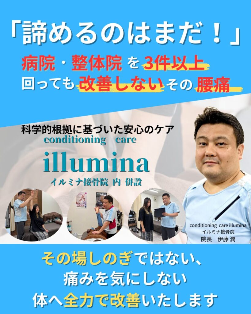 【コンディショニング ケア イルミナ】は、長年の痛みやしびれで悩む方々の「最後の砦」として解決の場所になります。 特に、1年以上痛みが続いている、3件以上病院や整骨院を回っても改善しなかったあなたは、 「この痛みはもう治らないんじゃないか…」 「誰にもこのつらさを分かってもらえない…」 「一体どうすればいいのか分からない…」 そんな深い悩みに、不安を抱えているのではないでしょうか。