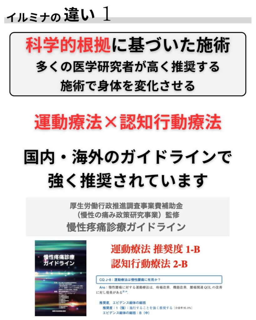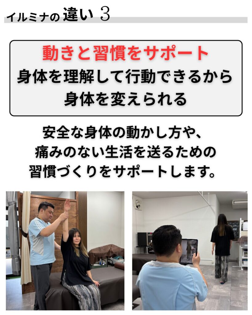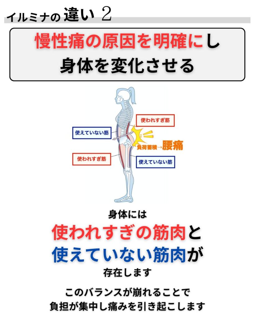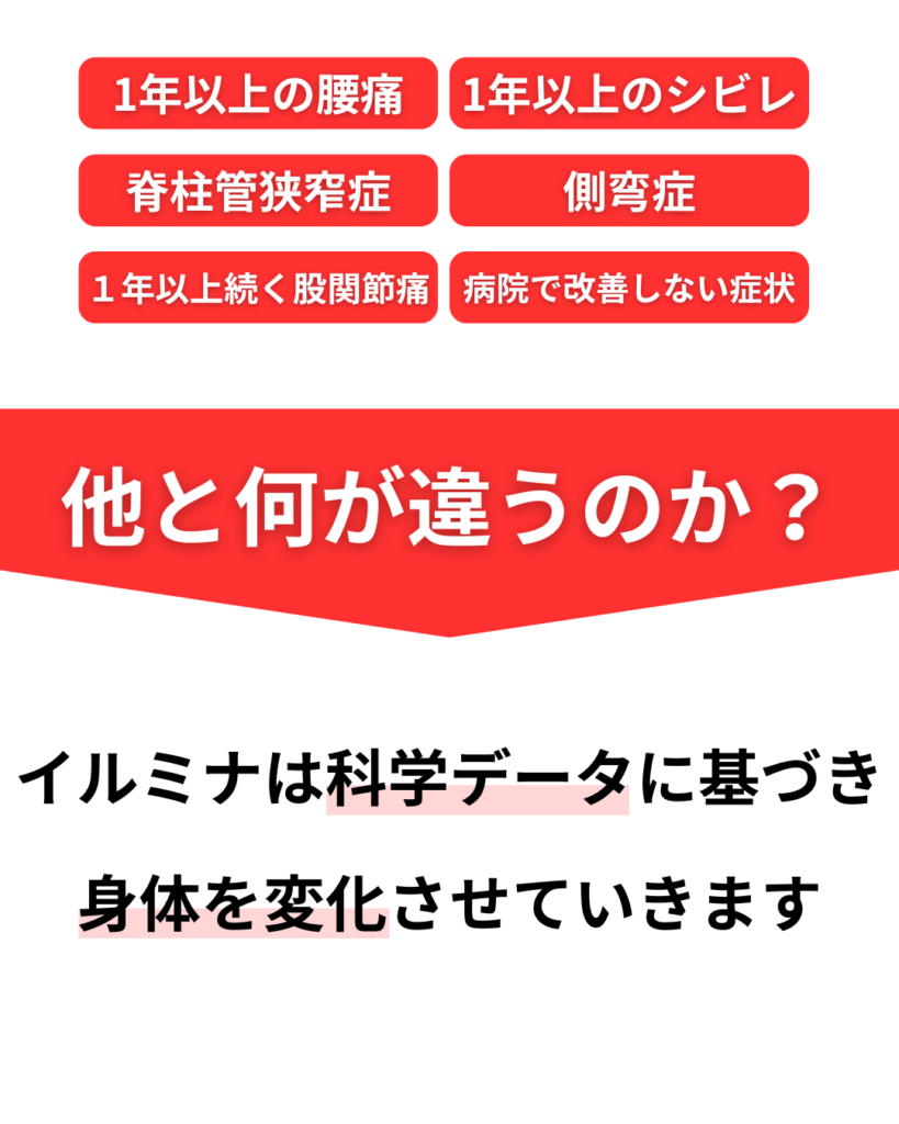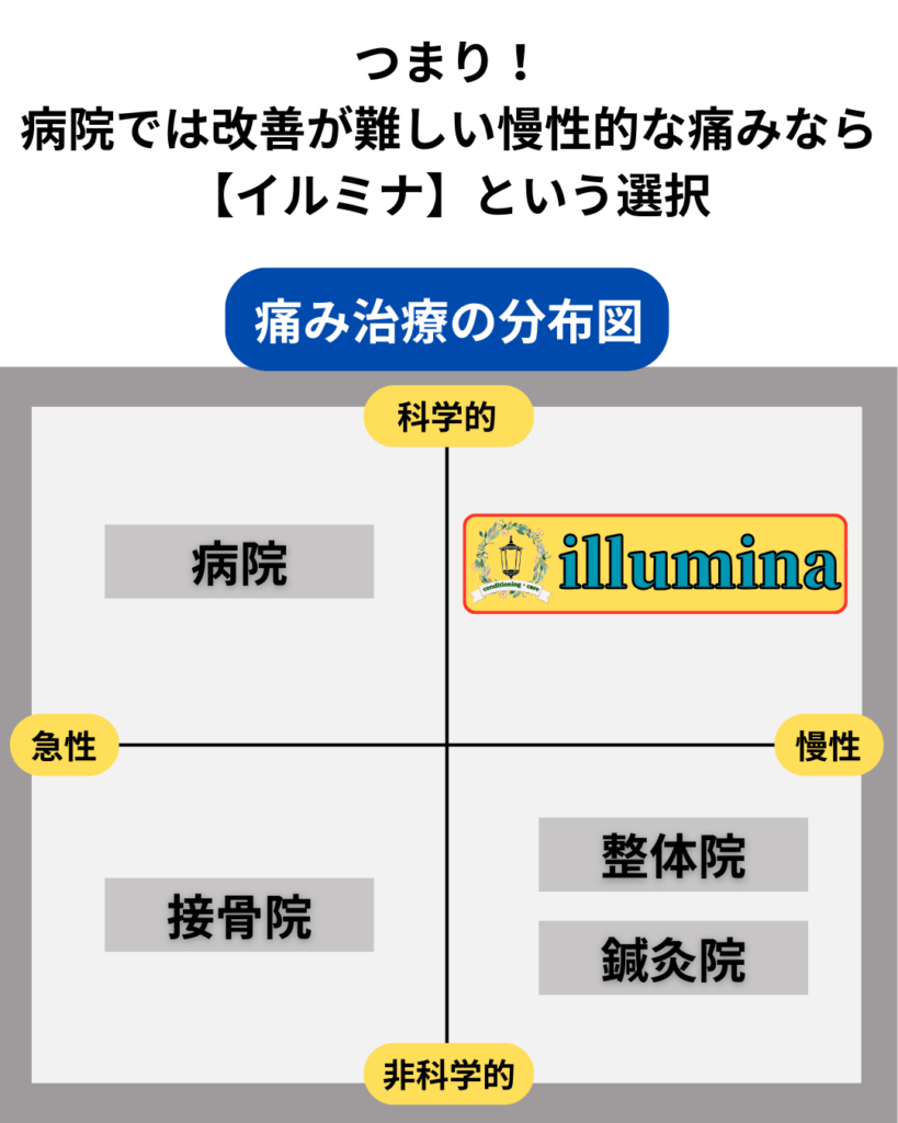 【イルミナ】は、もうこの痛みは改善しない、付き合っていくしかないのかな、、という不安に真正面から向き合い、一緒にあなたの痛み、悩みを改善していきます。