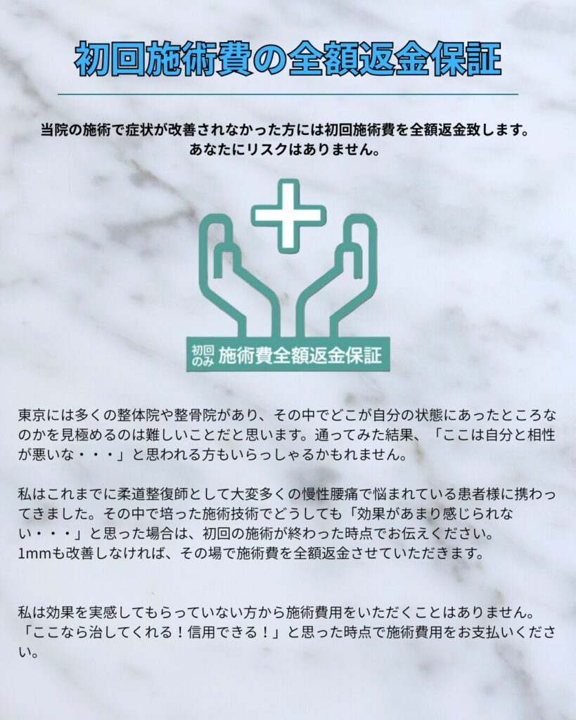 あなたのお身体が今どういう状態になっているのかを細かく説明致します。骨盤の傾き、立ち姿、これがどのようにして腰痛を引き起こしてしまうのかなどをお伝えします。