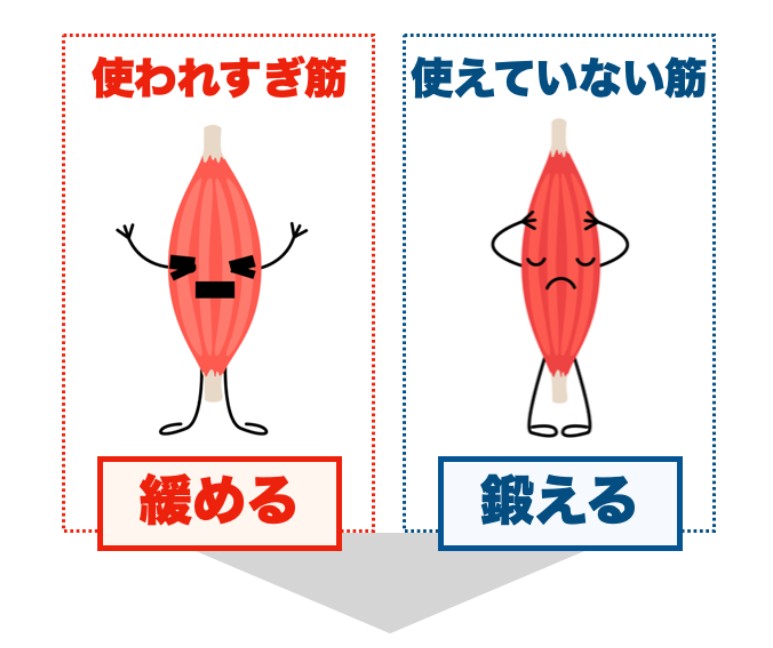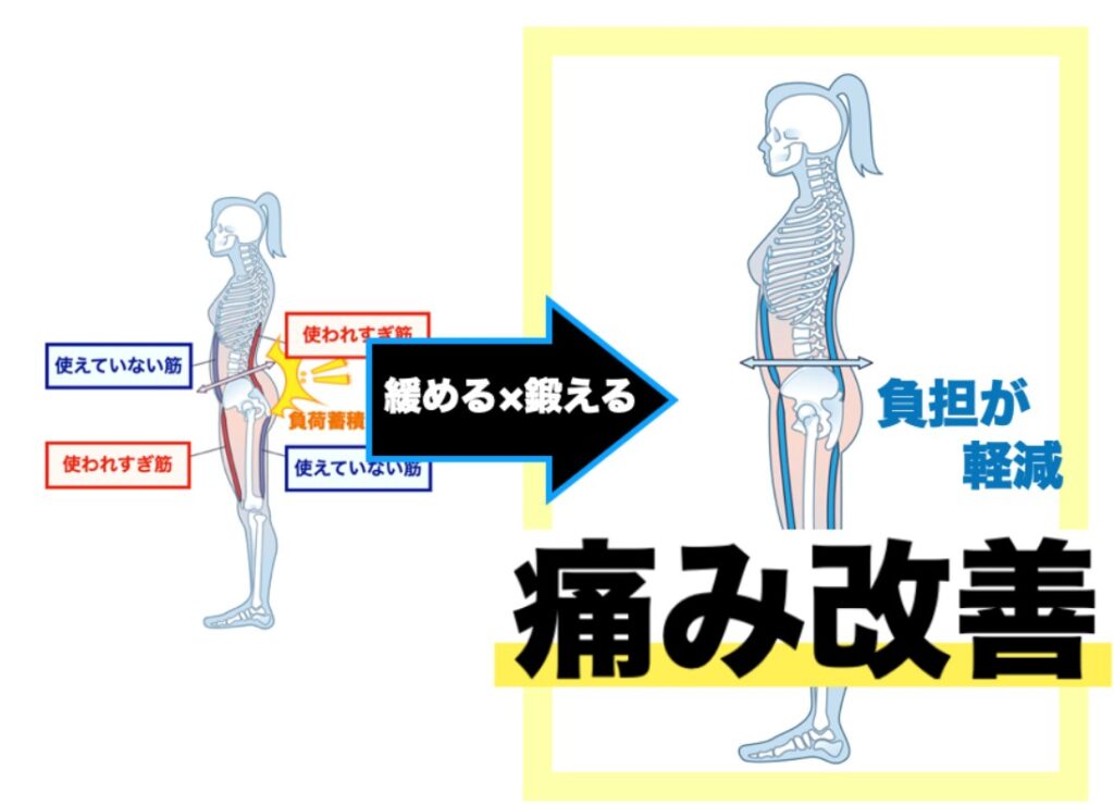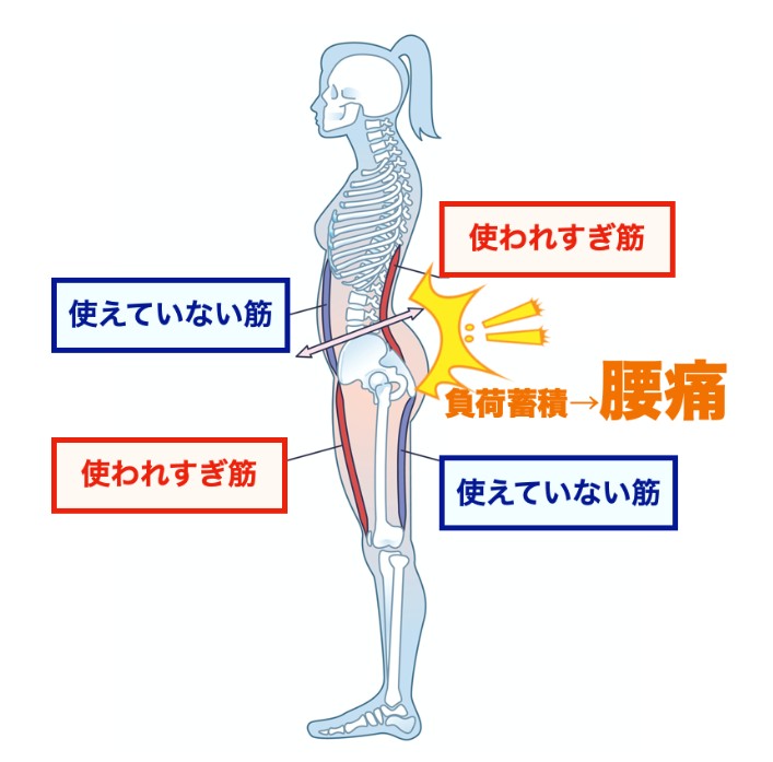 痛みのある方は、多くの場合、身体に「使われすぎている筋肉」と逆に「使えていない筋肉」が存在し、姿勢や動きが崩れています。これにより、腰の筋肉や関節に負担がかかり、腰痛を中心とした痛みやシビレが発生しているのです。